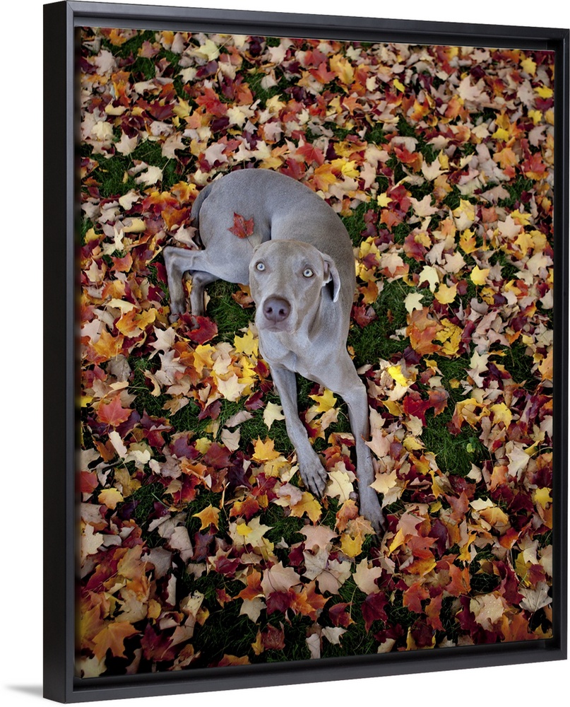 <p>Weimaraner resting on a bed of leaves, centerfold style, with one leaf stuck to his back as he looks up at the camera.</p>