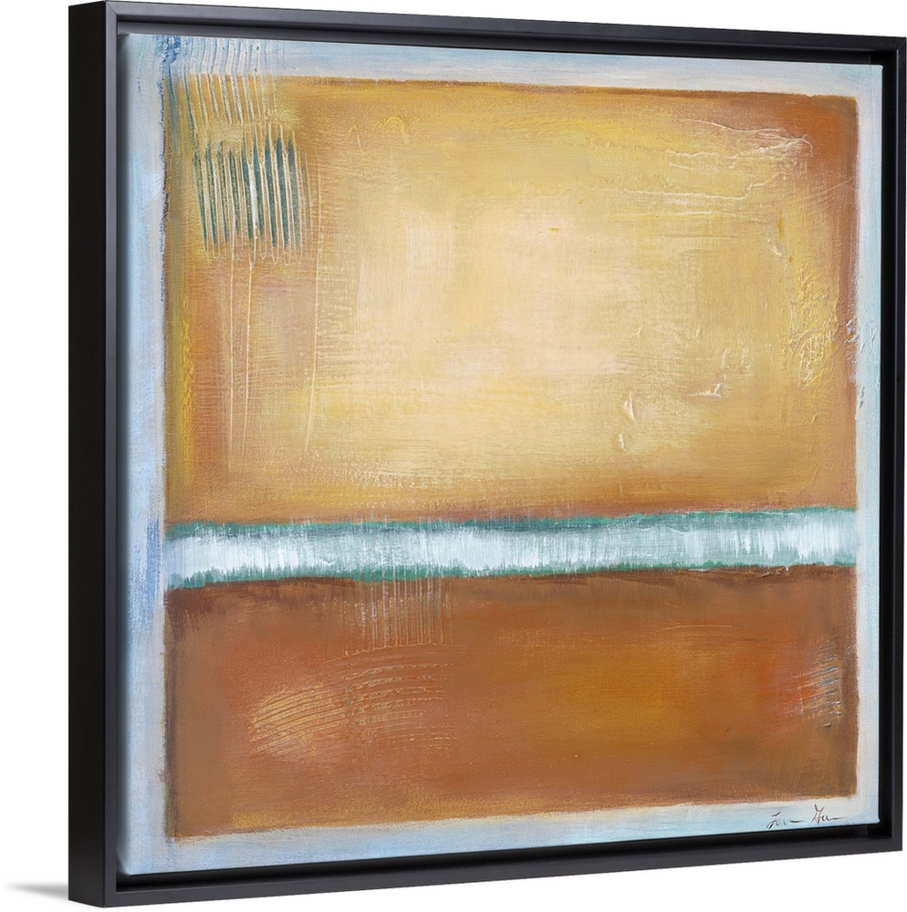<p>Square, abstract painting featuring large blocks of color in tan with light blue accents</p>