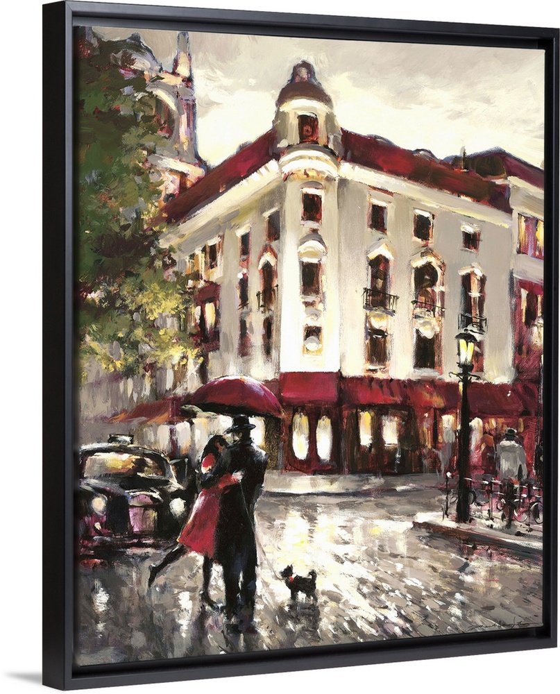 <p>Painting of a couple in a loving embrace standing under an umbrella in the rain.</p>