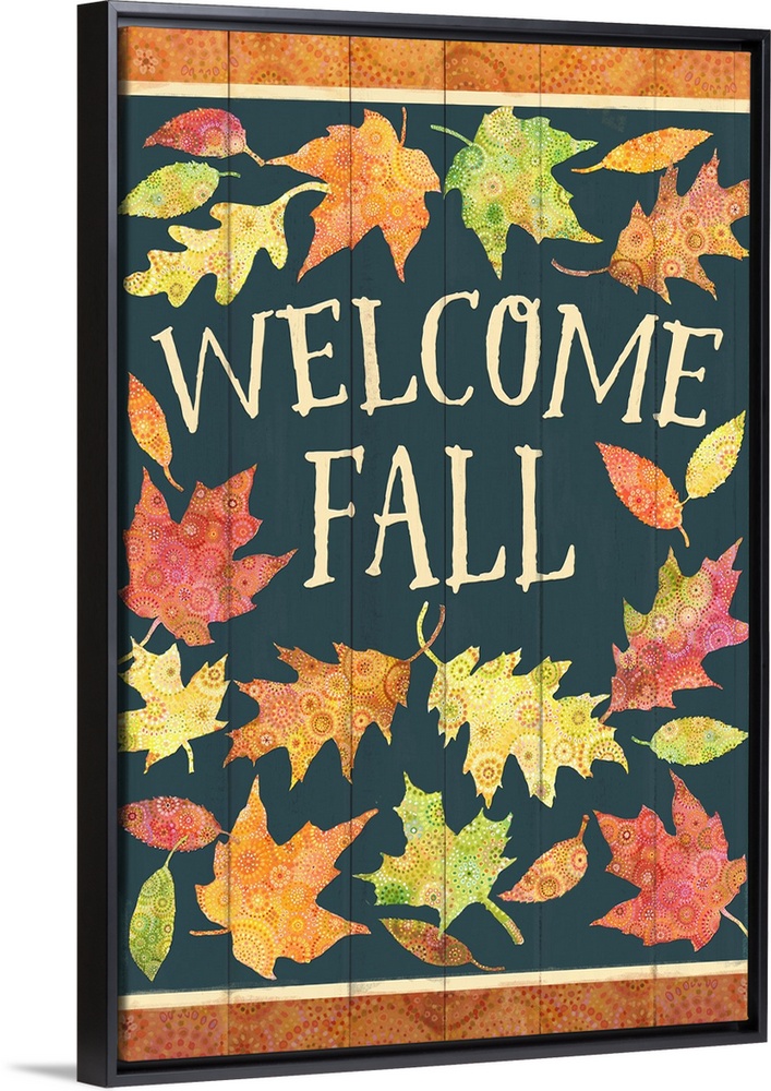 <p>Colorful patterned leaves welcome fall on a green painted board background.</p>