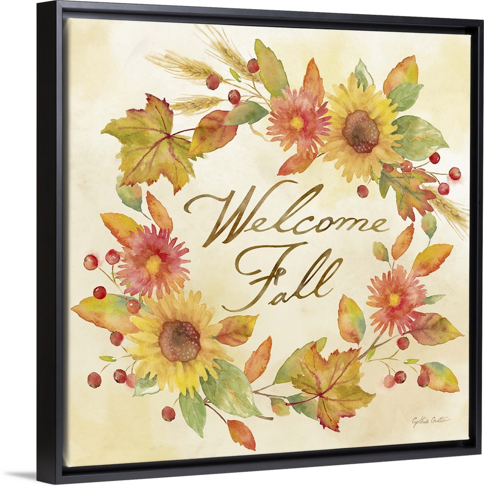 <p>"Welcome Fall" with wreath of autumn flowers and leaves in warm shades.</p>
