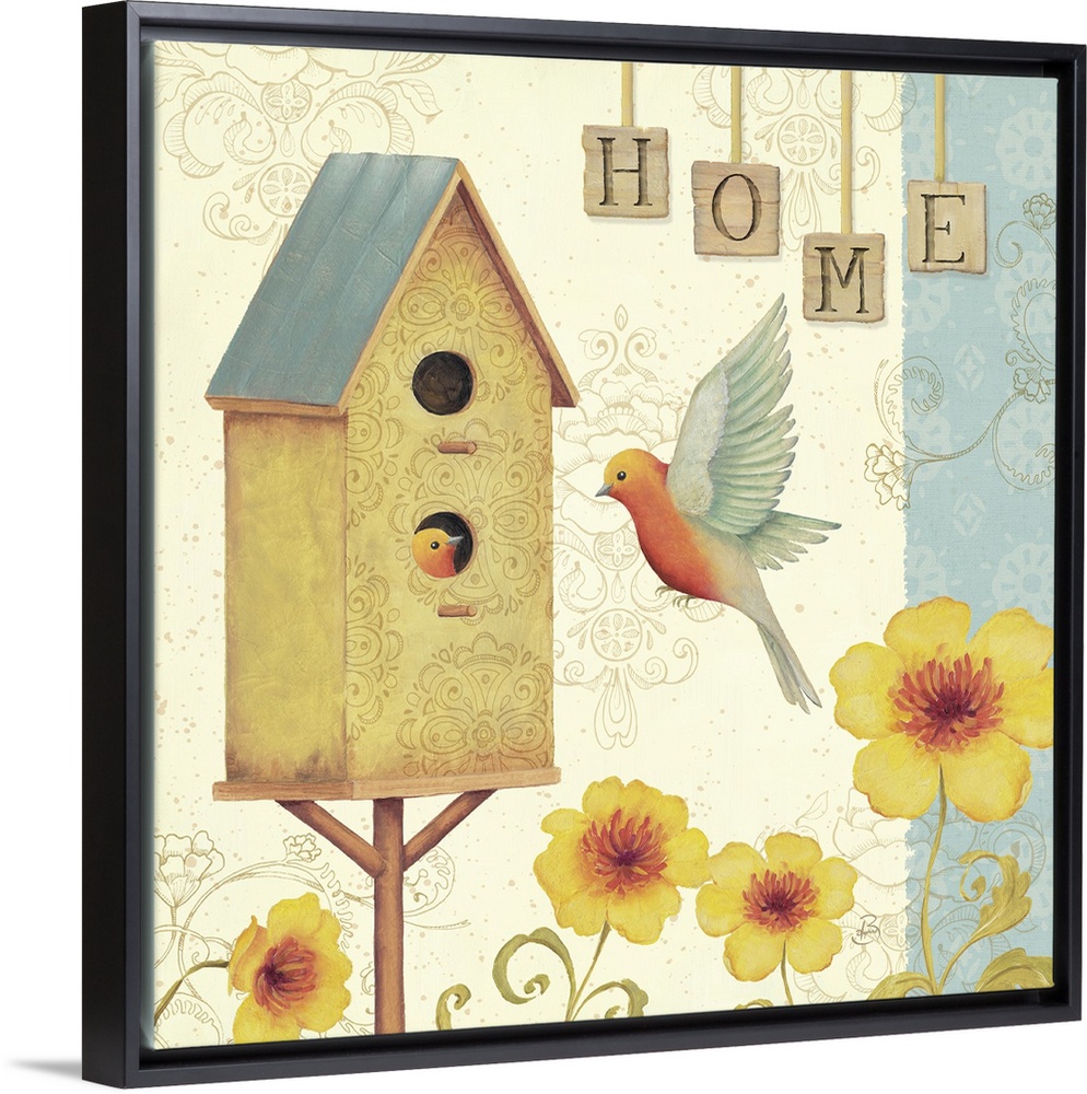 <p>Two songbirds with a bird house and yellow flowers underneath.</p>