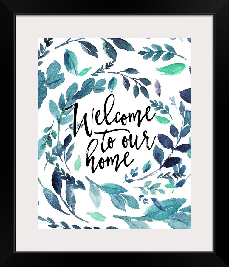 <p>Handlettered decor featuring the message, "Welcome to our home" in black text placed on a white background that is decorated with a watercolor leaves.</p>