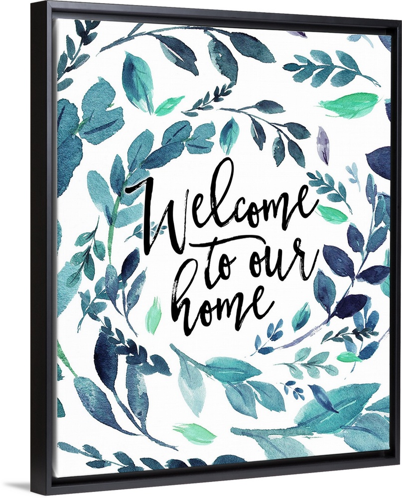 <p>Handlettered decor featuring the message, "Welcome to our home" in black text placed on a white background that is decorated with a watercolor leaves.</p>