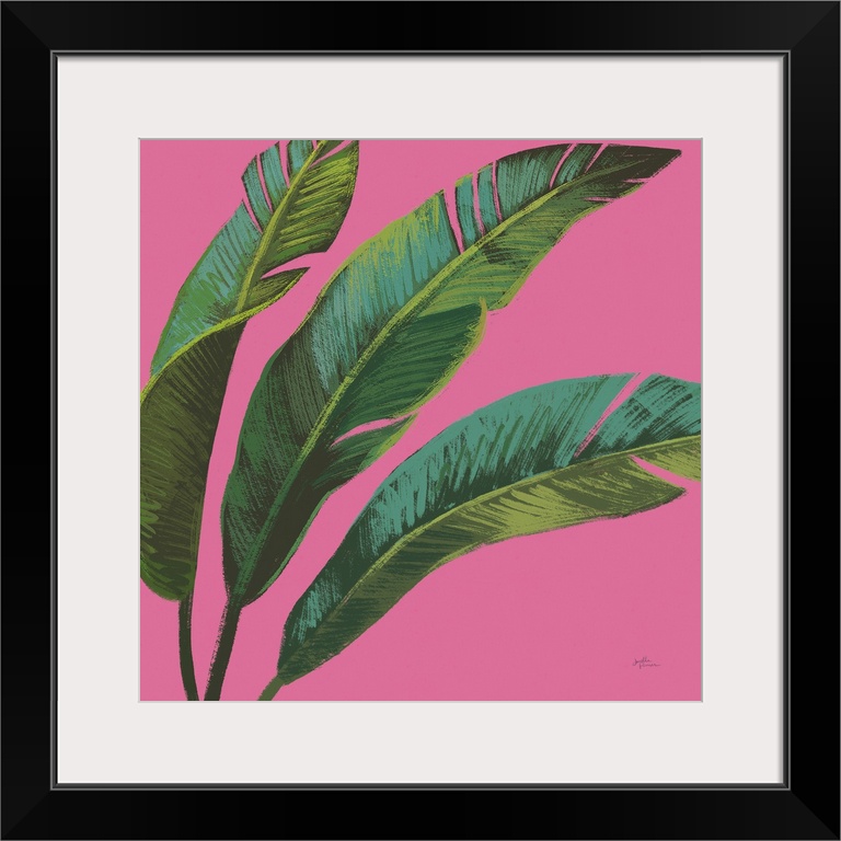<p>Illustration of palm leaves in shades of green with blue highlights on a bright pink, square background.</p>