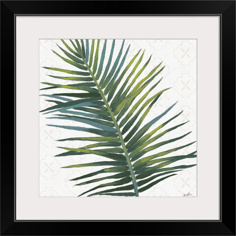 <p>Square art of a green palm leaf on a white background with a faint beige pattern.</p>