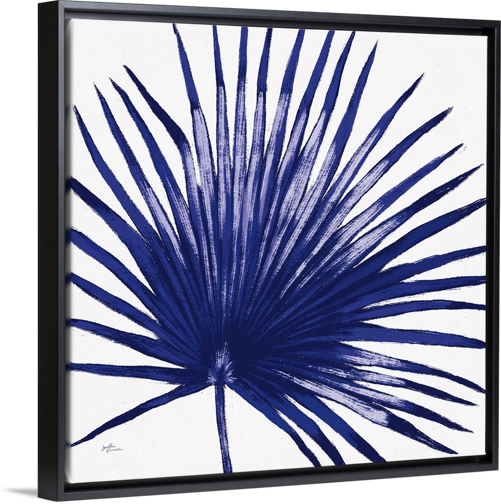 <p>Square decorative artwork of a large palm leaf in shades of blue.</p>
