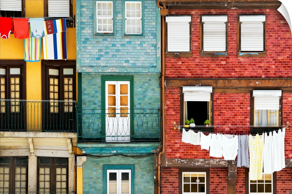 <p>These are typical colourful facades with hanging linen in the Ribeira district of Porto (Portugal).</p>