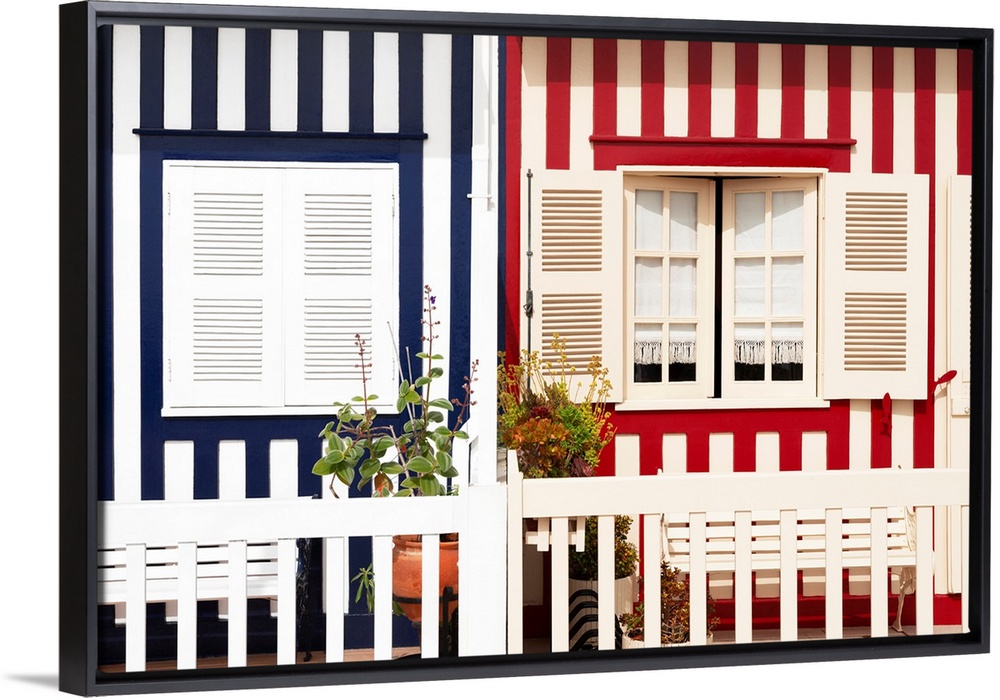 <p>These are two colourful striped facades of traditional houses at Costa Nova Beach in Portugal.</p>