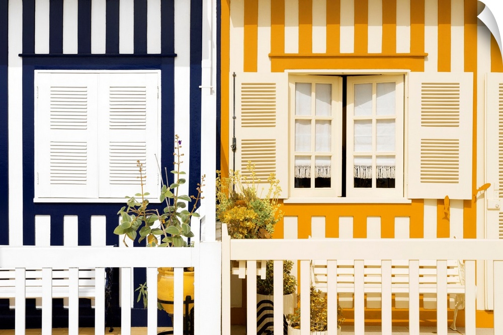 <p>These are two colourful striped facades of traditional houses at Costa Nova Beach in Portugal.</p>