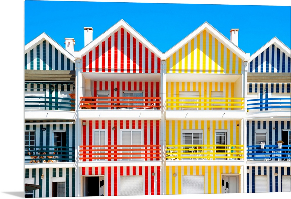 <p>These are four facades of colorful houses with stripes in Costa Nova Beach, Portugal.</p>