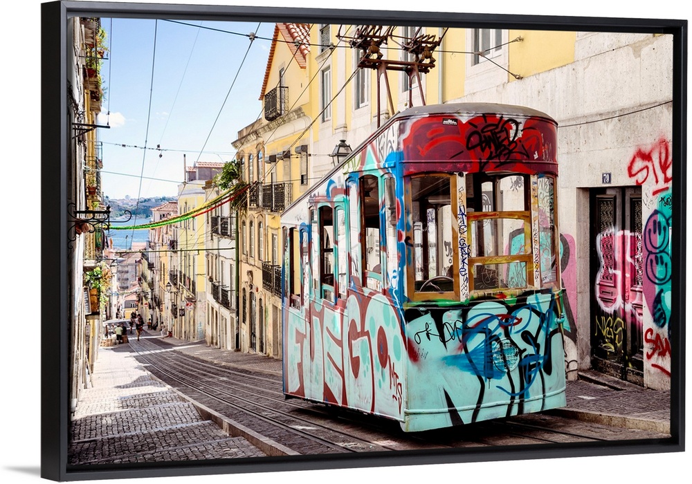 <p>It's the funicular of Bica with graffiti in the street Da Bica in Lisbon with colourful facades in Portugal.</p>