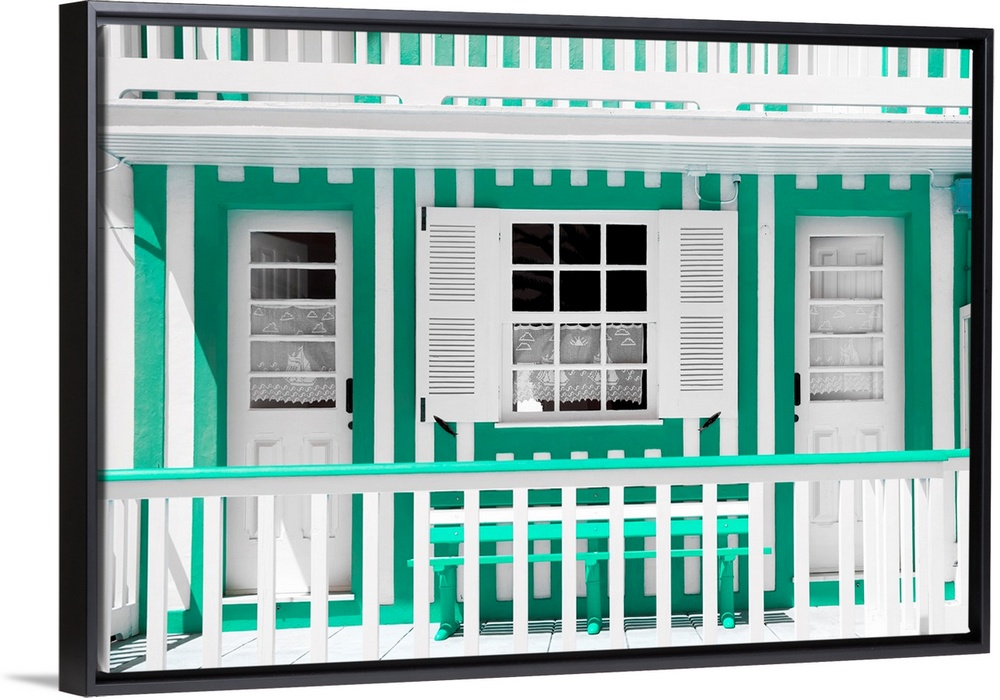 <p>It's a tradional white house facade with a bench and green stripes in Costa Nova Beach, Portugal.</p>