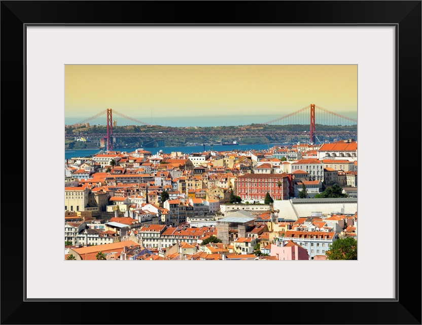 <p>It's a view of the city of Lisbon at sunset with the 25 de Abril bridge in Portugal.</p>