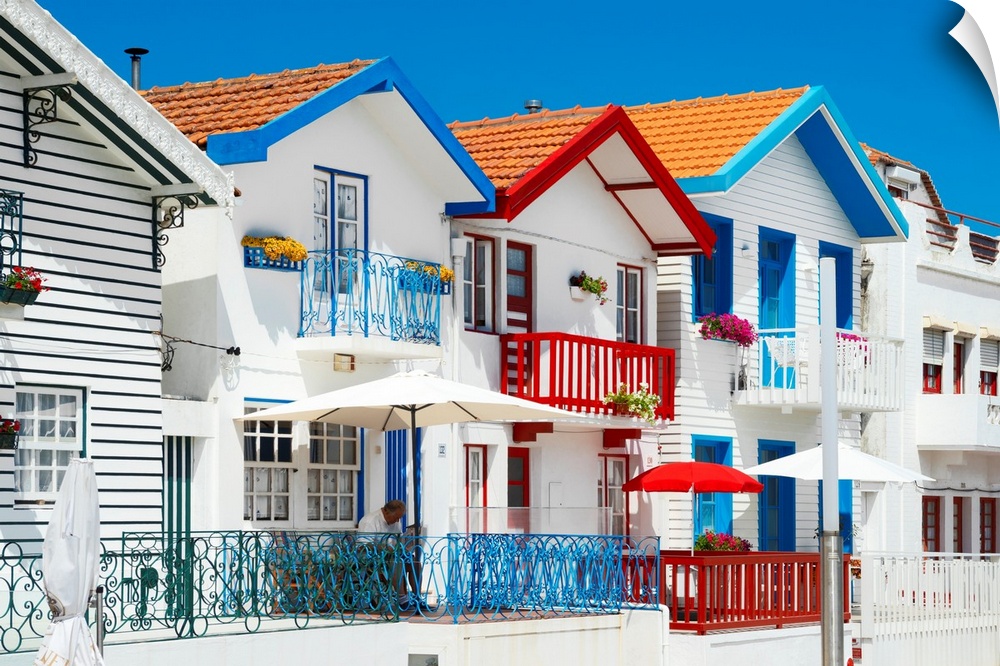 <p>These are colorful white houses with stripes in Costa Nova Beach, Portugal.</p>