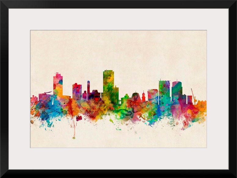 <p>Contemporary piece of artwork of the Wellington, New Zealand skyline made of colorful paint splashes.</p>