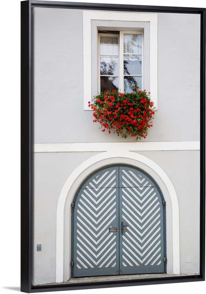 <p>Wels, Upper Austria, Austria - Red flowers are hanging from an open window over a teal door with white stripes. Vertical shot.</p>