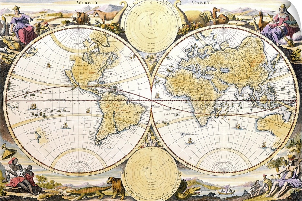 <p>XCF291089 Werelt Caert, engraved by Daniel Stoopendaal, 1663-C.1680 (coloured engraving) by Visscher, Nicolaes the Elder (1618-1709); 29.5x46.3 cm; Private Collection; (add. info.: note California as an Island and the incomplete coastlines of Northern America and Eastern Australia; from a Dutch bible); Dutch, out of copyright</p>