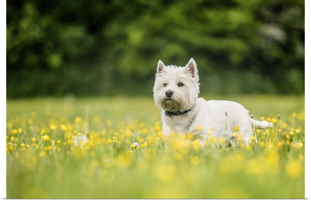 <p>West Highland Terrier standing in a field of yellow flowers, United Kingdom, Europe</p>