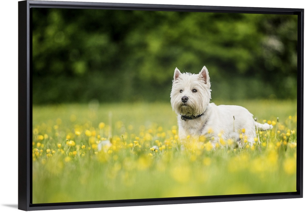 <p>West Highland Terrier standing in a field of yellow flowers, United Kingdom, Europe</p>