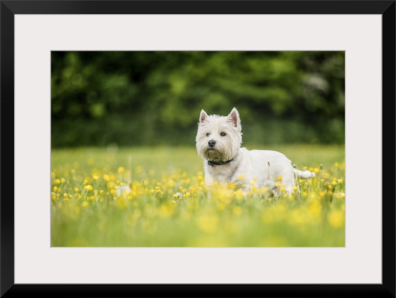 <p>West Highland Terrier standing in a field of yellow flowers, United Kingdom, Europe</p>