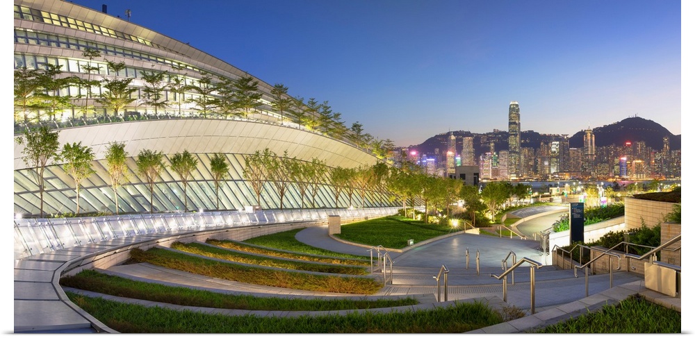 <p>West Kowloon High Speed Rail Station and skyline at dusk, Kowloon, Hong Kong.</p>