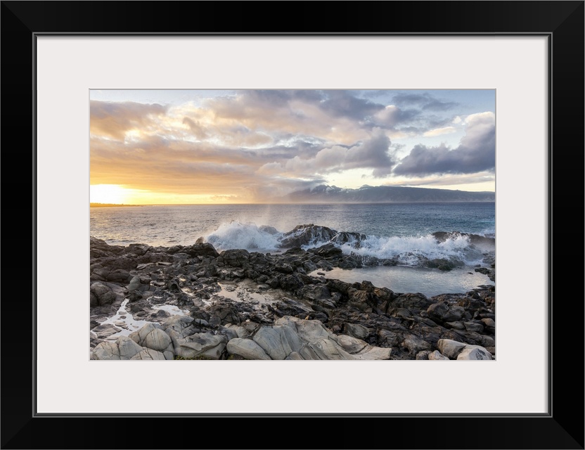 <p>Landscape photograph of a warm sunset over the ocean in Maui with waves crashing on rocks in the foreground.</p>