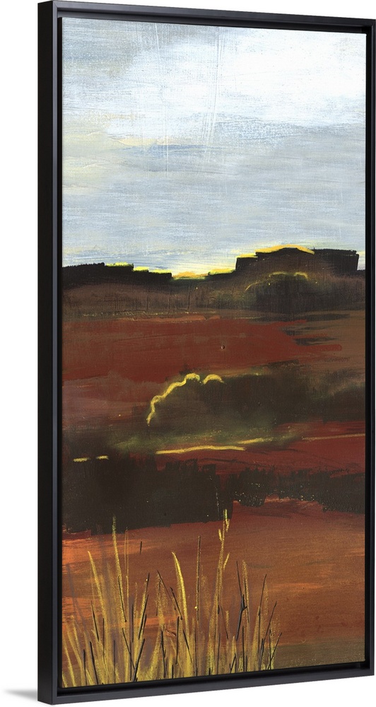 <p>A long vertical painting of an abstract landscape of a prairie field in textured earth tones.</p>