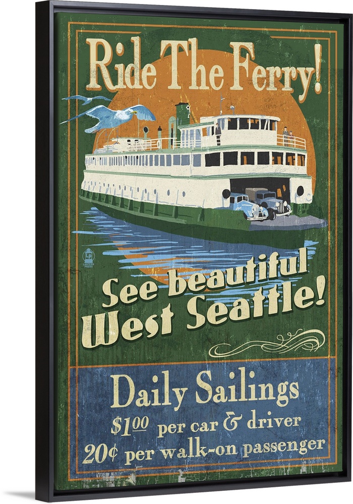 <p>Retro stylized art poster of a vintage sign with a ferry on the water.</p>
