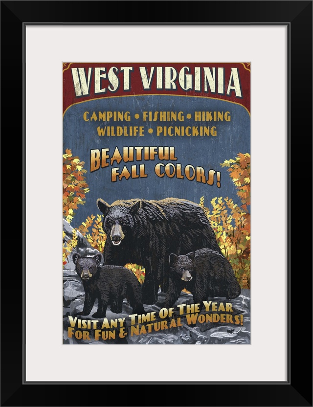 <p>Retro stylized art poster of a black bear mother with her two cubs in the wild.</p>