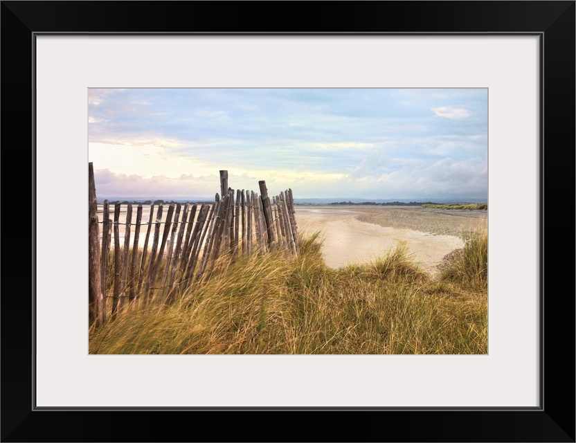 <p>Photograph of beach with grass covered dunes, on a cloudy day.</p>