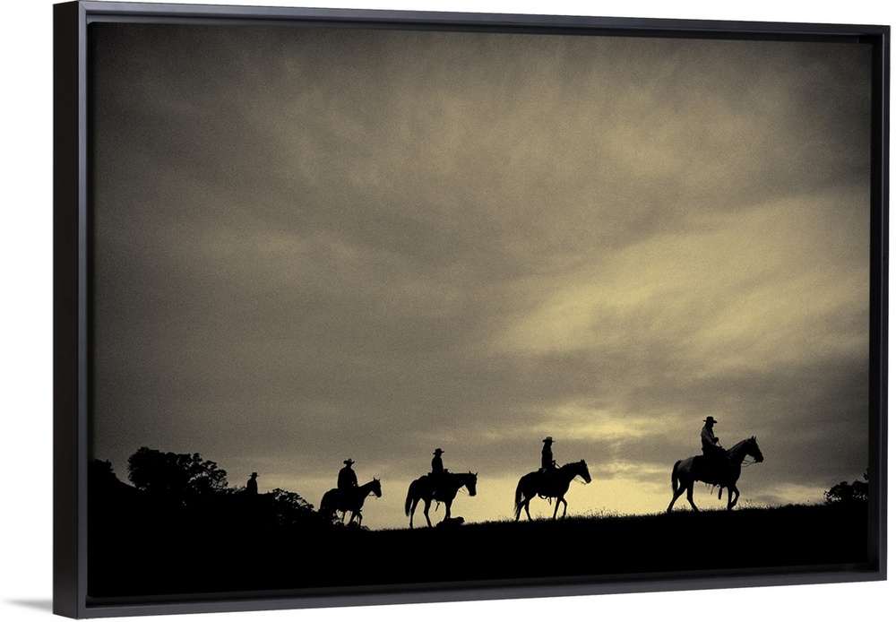 <p>Sepia-toned photo of four cowboys on horseback silhouetted against an overcast sky.</p>