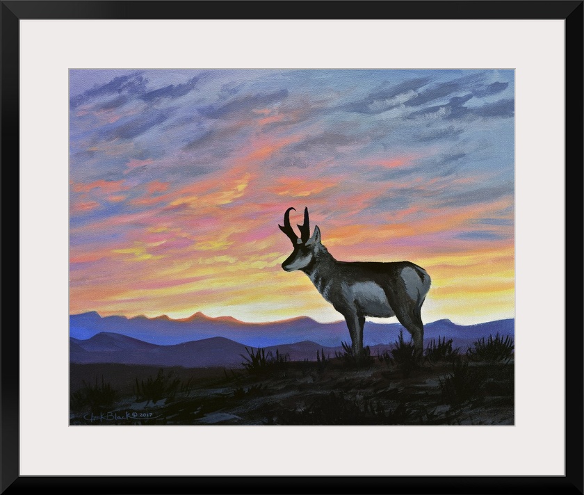<p>Contemporary painting of a deer standing outside with a beautiful sunset in the sky over the mountains.</p>