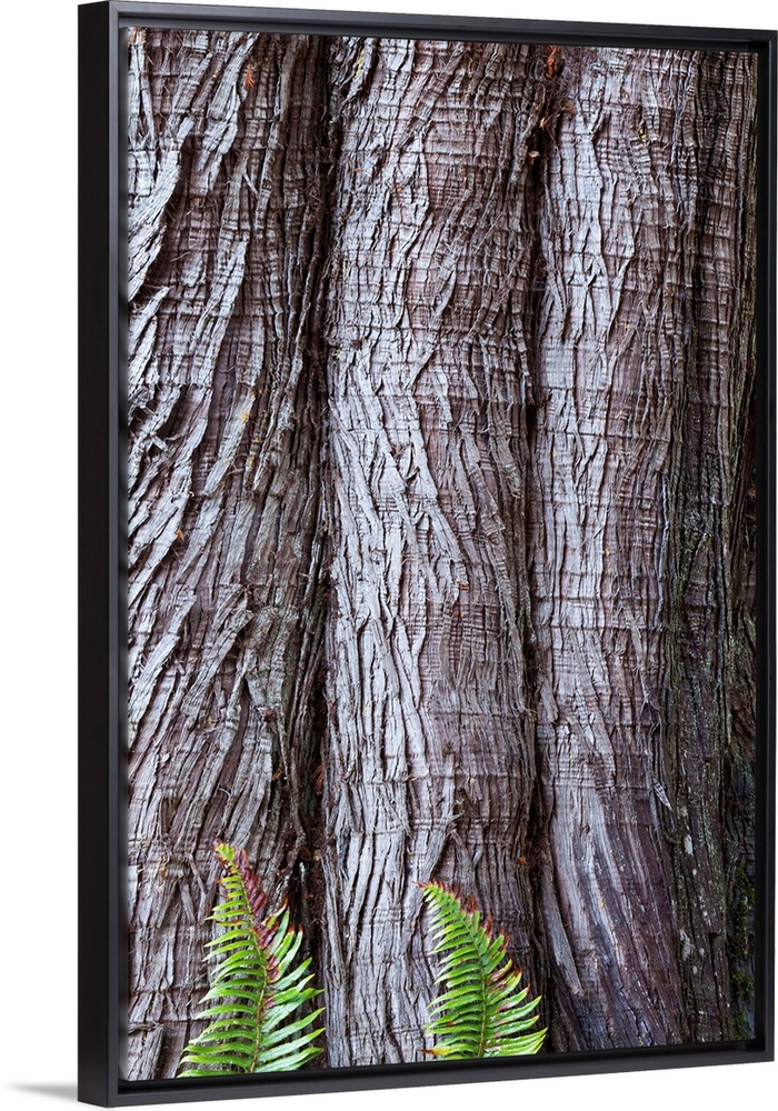 <p>USA, Washington State, Western red cedar Thuja plicata bark with Sword ferns Polystichum Munitum at base</p>