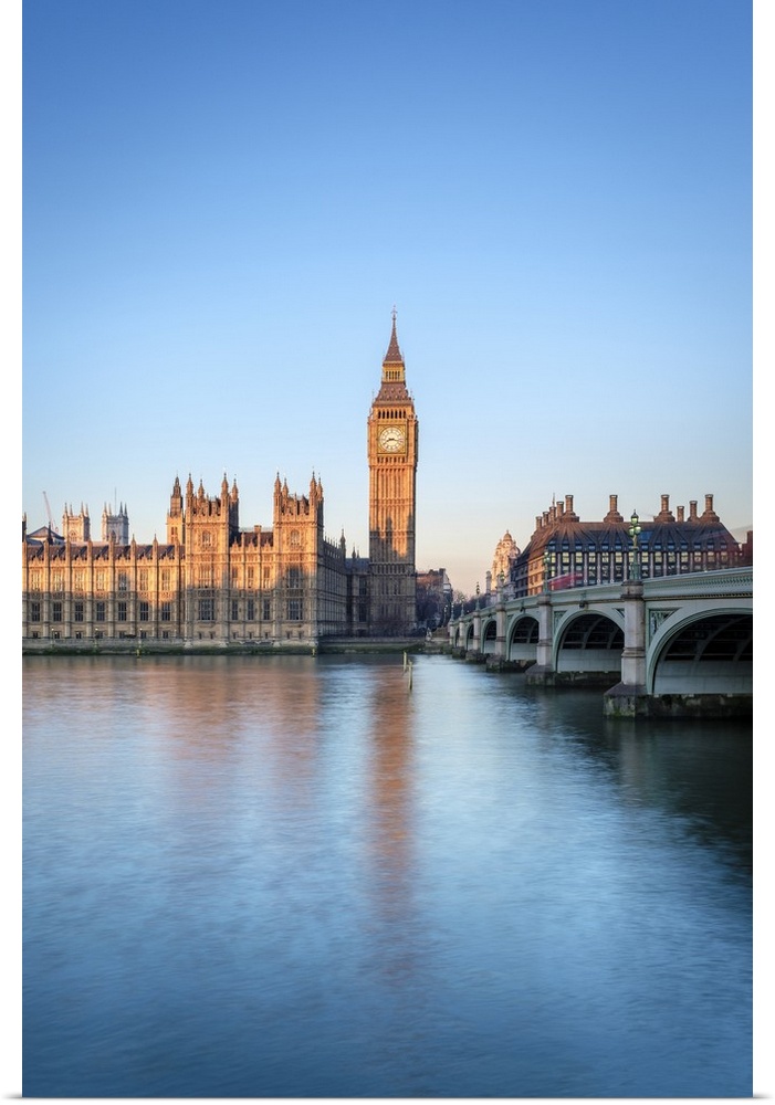<p>United Kingdom, England, London. Westminster Bridge, Palace of Westminster and the clock tower of Big Ben (Elizabeth Tower), at dawn.</p>