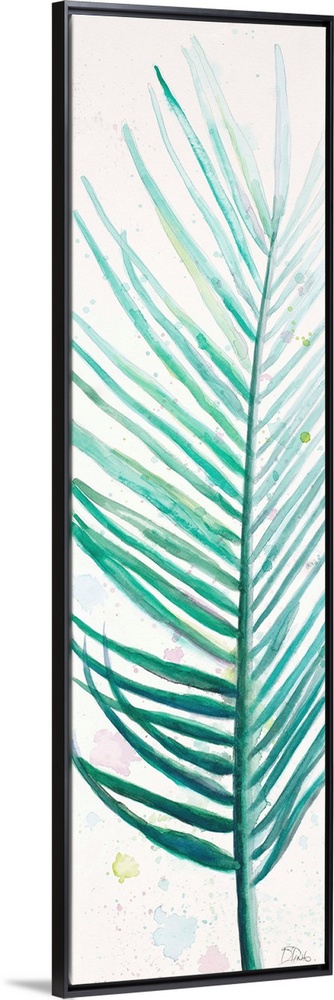 <p>Tall watercolor painting of a green-blue palm leaf with light colorful paint spatter on the white background.</p>