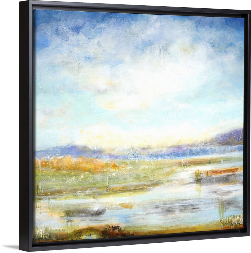 <p>Contemporary landscape painting looking out over wetlands under a vibrant blue sky.</p>