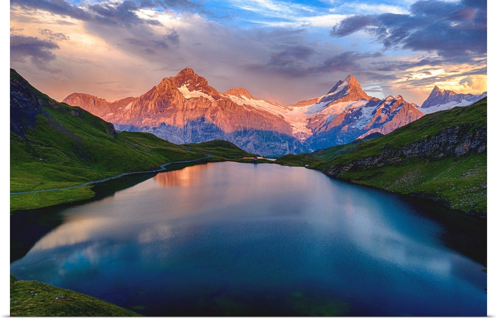 <p>Wetterhorn, Schreckhorn and Finsteraarhorn at sunset from Bachalpsee lake, Grindelwald, Bernese Oberland, Switzerland, Europe</p>
