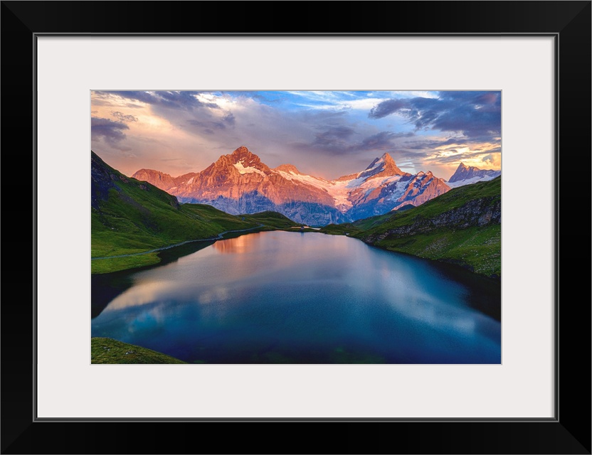<p>Wetterhorn, Schreckhorn and Finsteraarhorn at sunset from Bachalpsee lake, Grindelwald, Bernese Oberland, Switzerland, Europe</p>