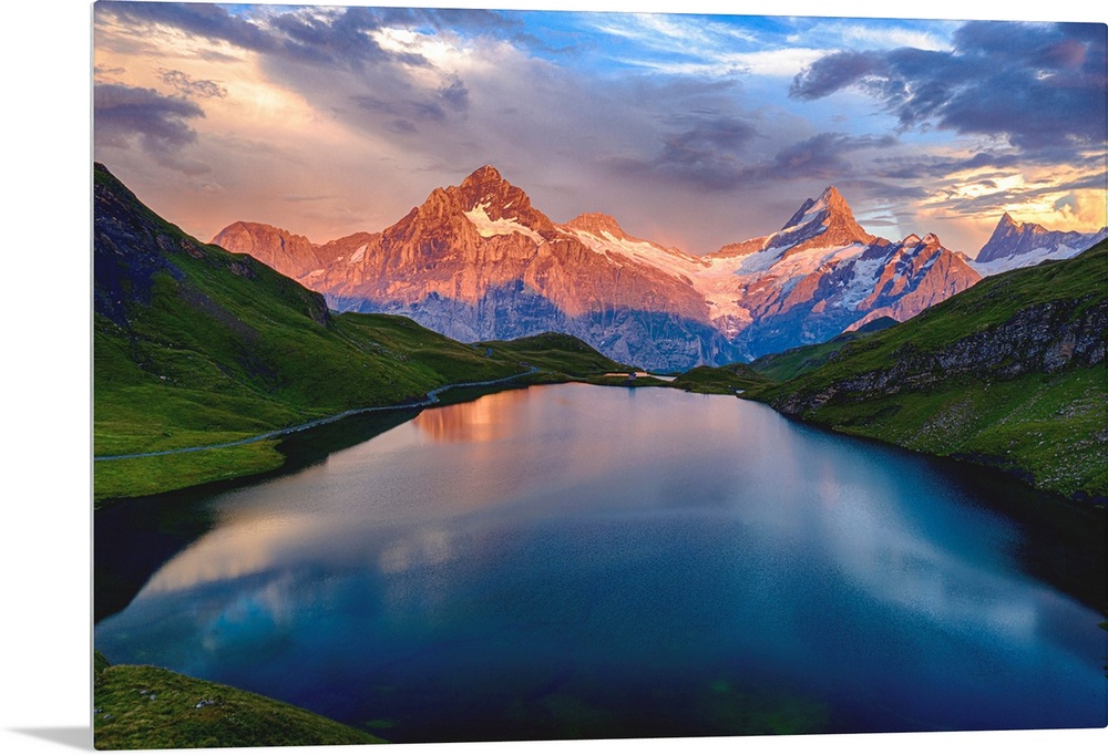 <p>Wetterhorn, Schreckhorn and Finsteraarhorn at sunset from Bachalpsee lake, Grindelwald, Bernese Oberland, Switzerland, Europe</p>