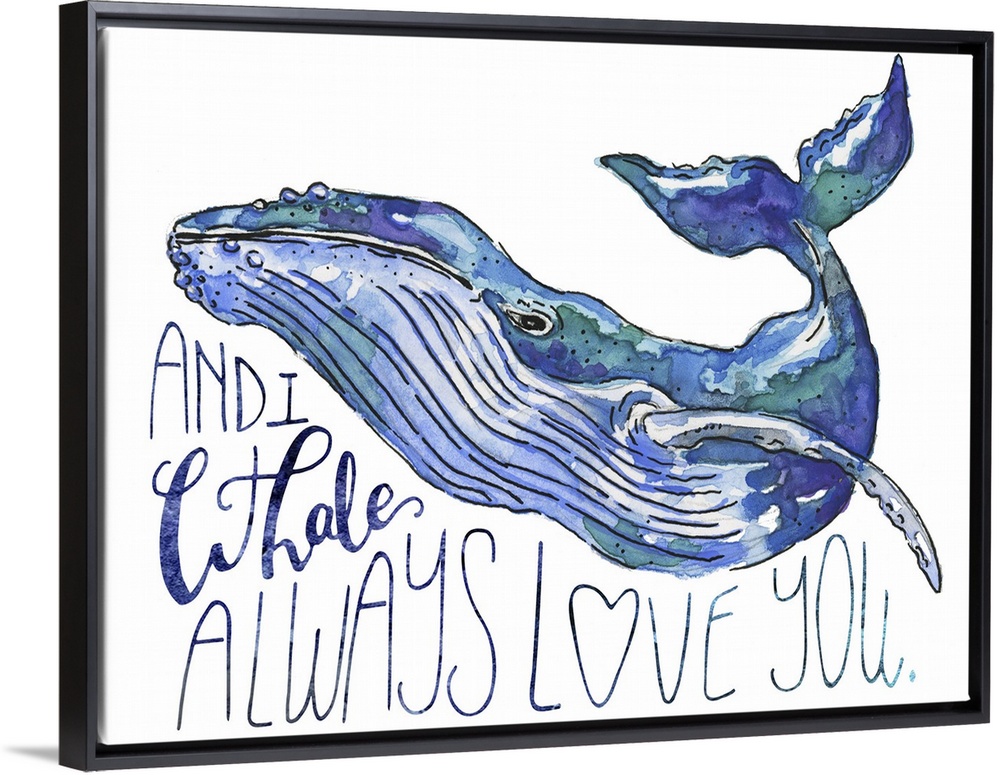 <p>A watercolor whale drifts against a white background with the pun: And I whale always love you.</p>