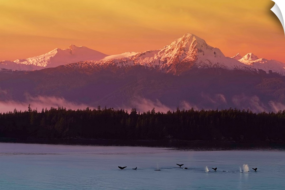 <p>Big landscape photograph of numerous whale tails breaking the surface of the water, beneath the snow capped Chilkat Mountains in Alaska, at sunrise.</p>