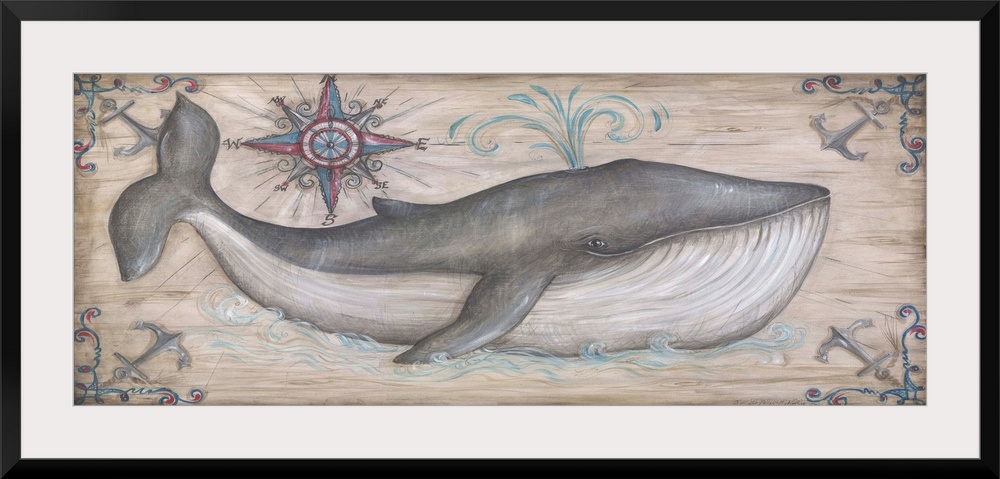 <p>Large painting of a whale spewing water out of its blowhole with a blue and red compass rose above it and decorative anchors in each corner.</p>