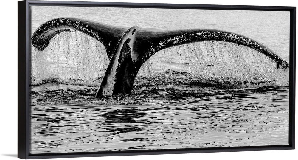<p>Black and white photograph of a whale's tail sinking back into the water dripping water.</p>