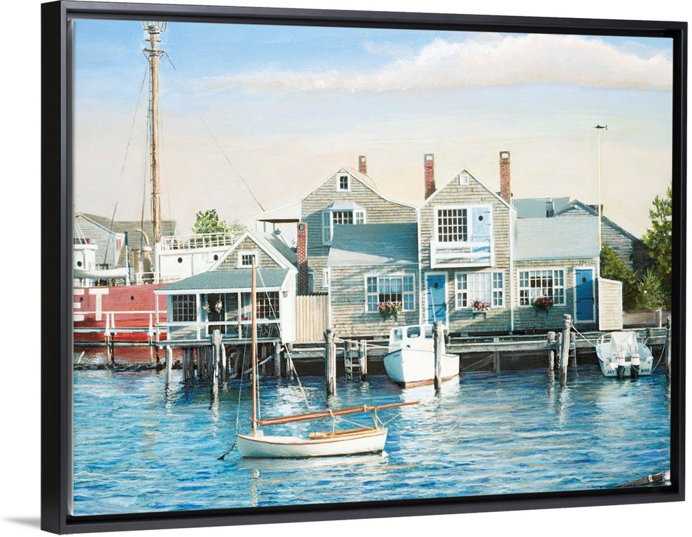 <p>Houses on harbor wharf with dock and moored boats.</p>