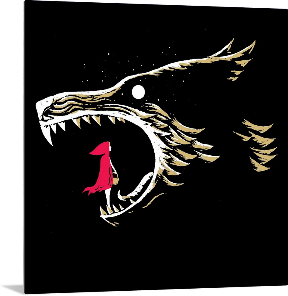 <p>A square illustration of little red riding hood at the base of the wolf's mouth.</p>