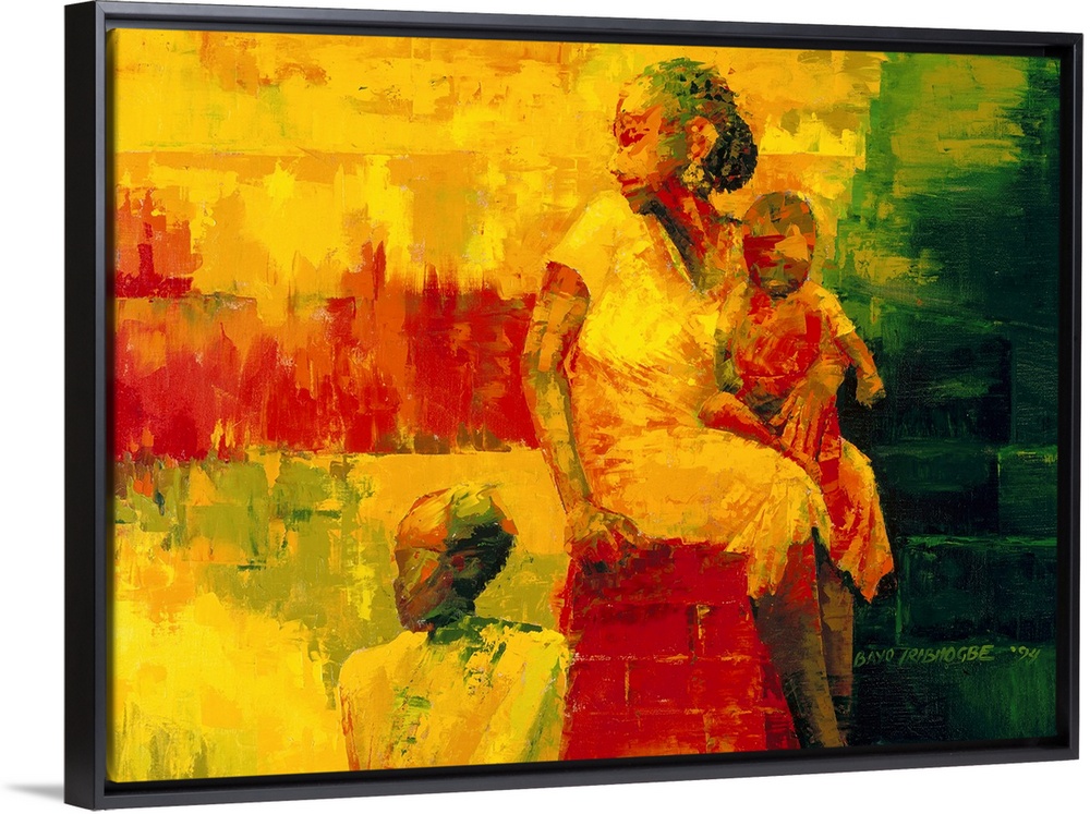 <p>Contemporary African American artwork created with abstract paint application of a woman and two children sitting on a wall looking at something out of view.</p>