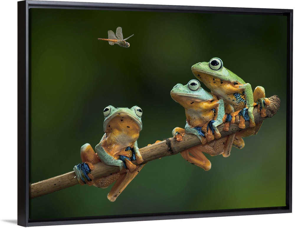 <p>Three tree frogs sitting on a branch watch a fly above.</p>