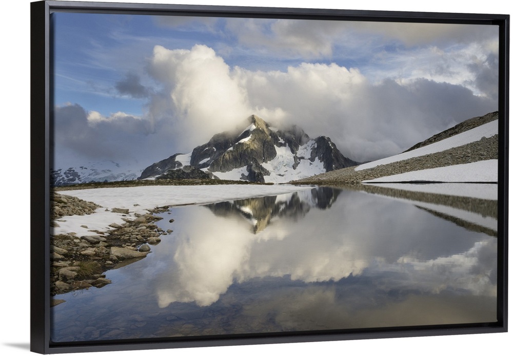 <p>Whatcom Peak shrouded in clouds and reflected in upper Tapto Lake, North Cascades National Park, Washington State</p>