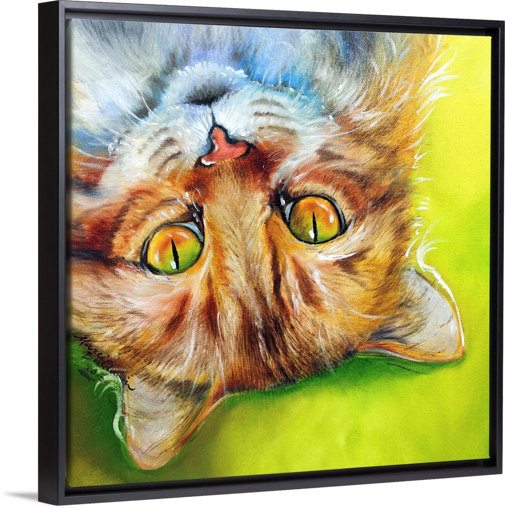 <p>Square painting of an orange striped cat laying upside down on a bright green and yellow background.</p>